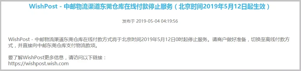 最后小可爱也有一个提醒:再过2天,Wishpost中邮物流渠道东莞仓库在线支付方式将停止服务。