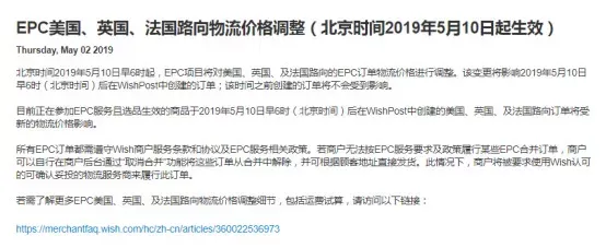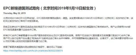 2019年5月10日生效的,除了Wish物流EPC新增德国测试路向,同时EPC合并订单服务美国路向、英国路向、法国路向的物流价格将进行调整也将在同时生效。