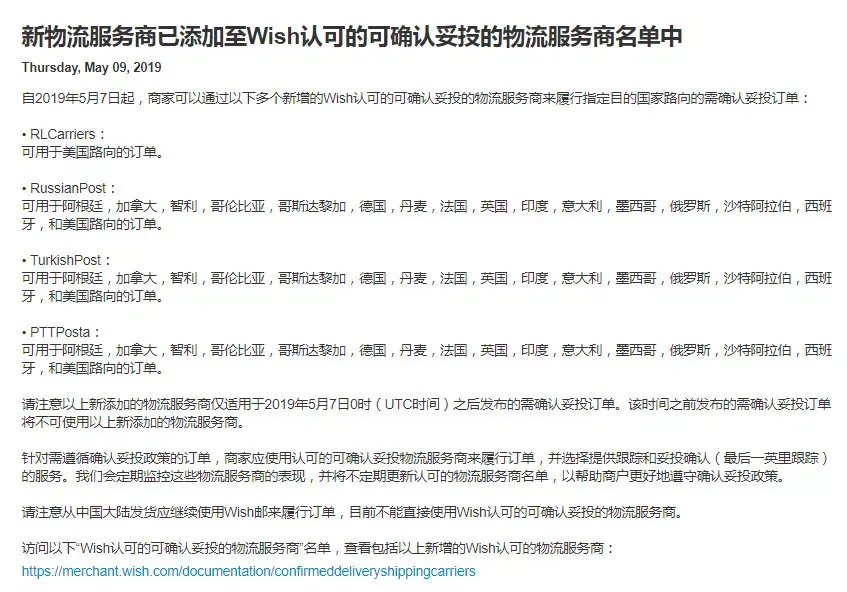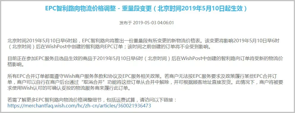 5月3日,Wish又再次发公告告知EPC合并订单服务智利路向的物流价格有所调整。