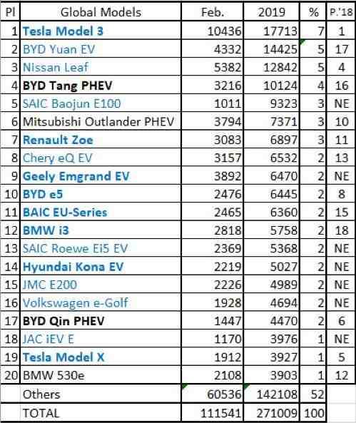 2019年全球电动车的销量成绩单(Source:EV sales blog)