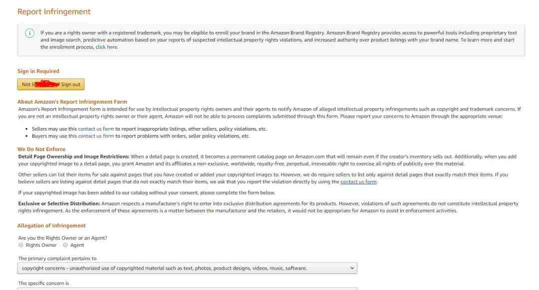 3. 实在没办法了,只能向亚马逊投诉了,那我及时进入了infringement 页面,在这里我选择了投诉对方商标侵权,相应的提供了我的商标号,以及告知亚马逊我店铺已经品牌备案。