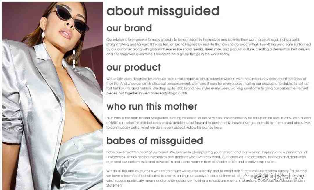 时装品牌Missguided成立于2009年,在美国、欧洲和英国都有网站。它的网站,产品和文字都精炼,主页非常简洁。最特别的,当属文字描述。所有内容,从类别描述到“About”版块,都是专门为理想购物者撰写。
