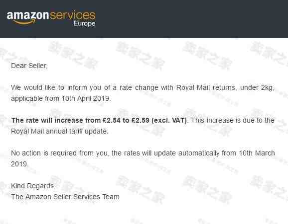 邮件内容中指出,从2019年4月10日起,英国皇家邮政(Royal Mail)的退税率,2公斤以下,税率将从2.54英镑增加到2.59英镑(不含增值税)。这一增长是由于皇家邮政年度关税更新。卖家无需采取任何措施,价格将自2019年3月10日起自动更新。