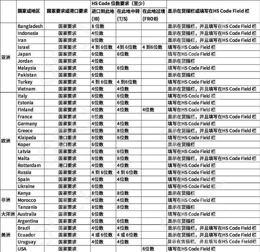 近年来,各国进口海关纷纷要求在进口的货物提单的信息中显示HS CODE的信息。目前各国对HS CODE的要求如下: