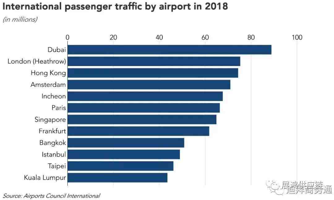 迪拜机场最新数据显示,迪拜国际机场(DXB)2018年客流总量8915万人次,全球排名第三,仅次于亚特兰大机场(ATL)和北京国际机场(PEK)。