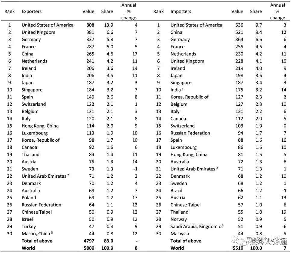 服务贸易方面,阿联酋2018年进出口均为710亿美元,占全球进出口比重分别为1.3%和1.2%,分列第21位和第22位。