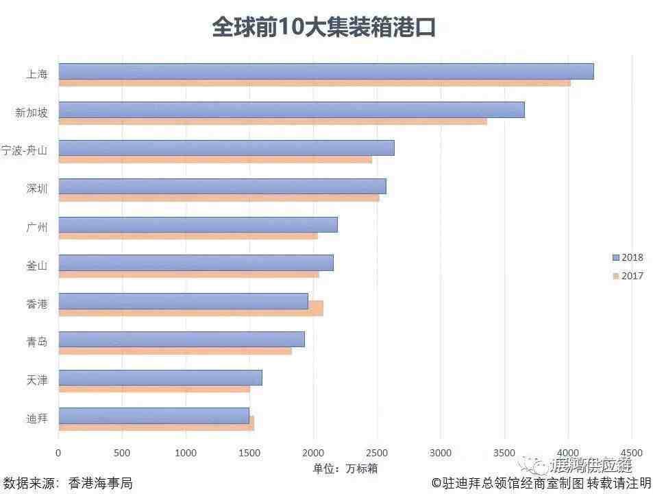 香港海事局的数据显示,迪拜杰贝阿里港(Jebel Ali Port)2018年集装箱吞吐量为1495.4万标箱(TEU),名列全球第10大集装箱码头。