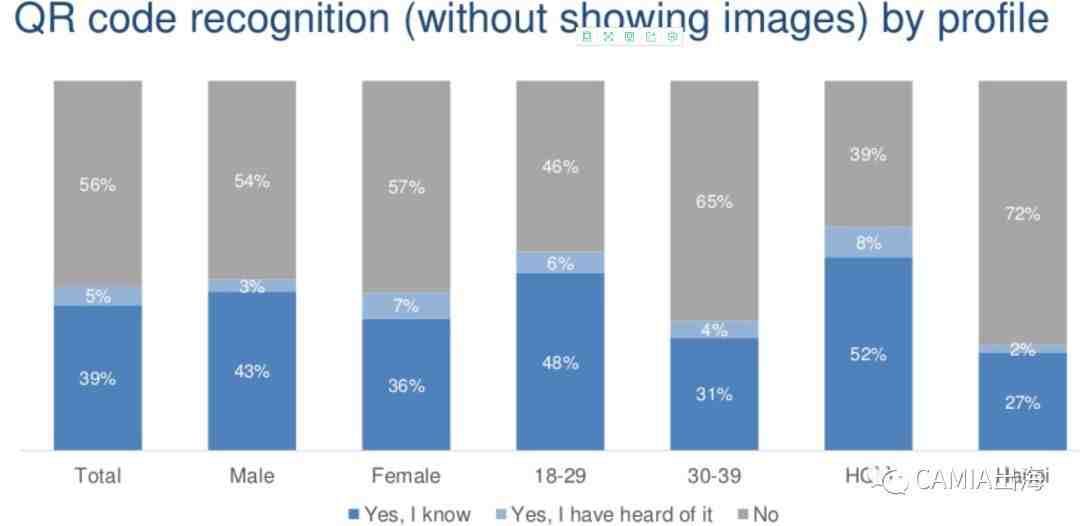 根据调查数据,仅有39%的受访者明确知道二维码(QR码)支付。大部分受访者(61%)并不了解QR码支付这种数字支付方式。