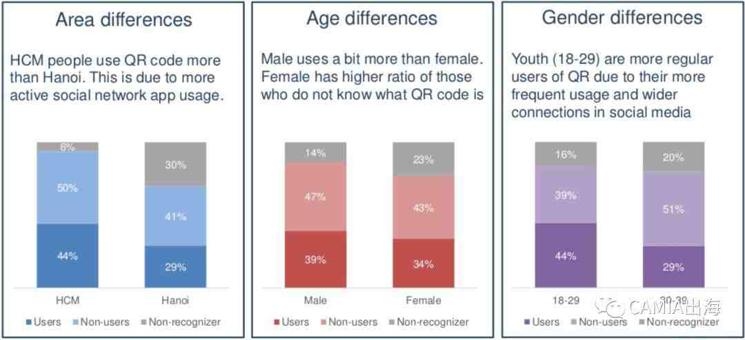 其中18-29岁消费者对QR码支付的认知程度较高。与此同时,胡志明市和河内两大中心城市对比,胡志明市消费者对QR码支付的认知程度显然远远高于河内。