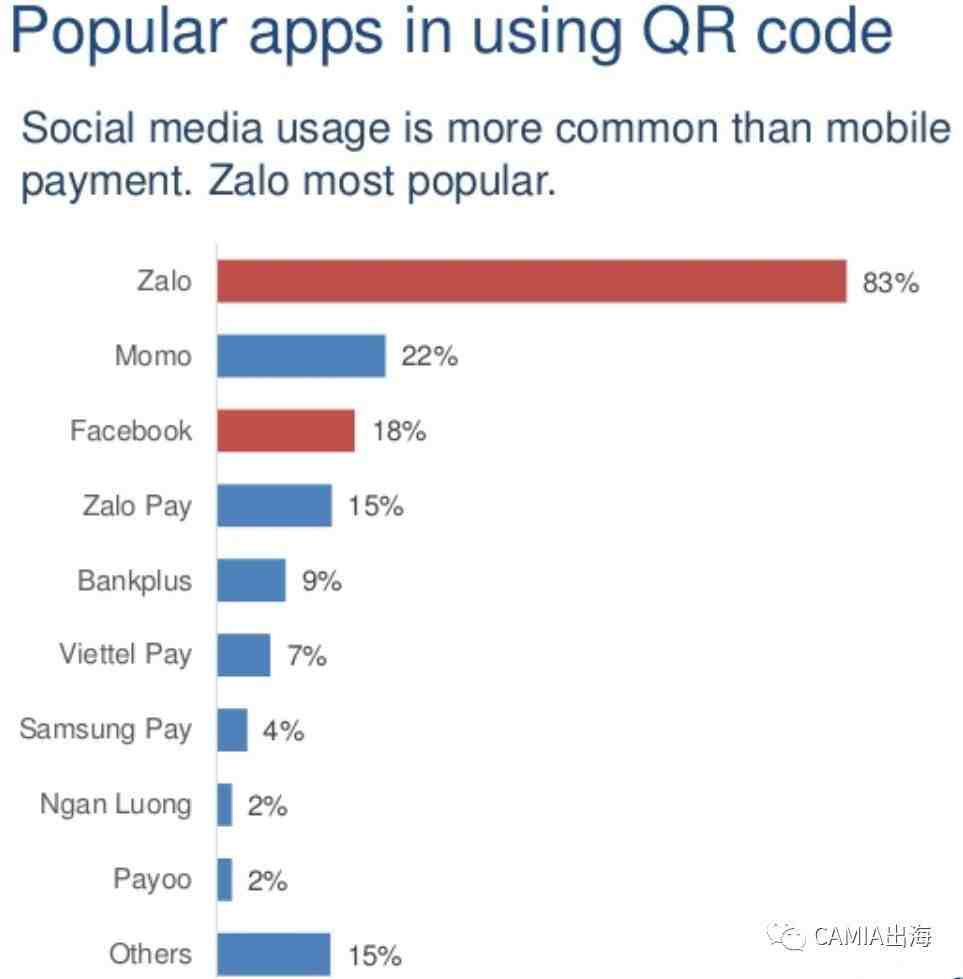 在可以使用QR码支付的手机应用程序中,社交媒体应用的使用程度远远高于手机支付应用。其中越南本土“微信”Zalo的使用指数最高,其中在使用二维码支付的受访者当中有83%受访者使用Zalo的QR码支付。