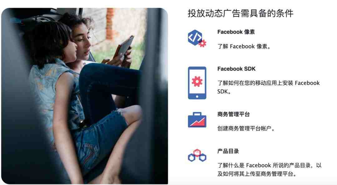 总结来说,它是一款无需手动操作的个性化广告、能够跨设备覆盖受众,以及再定位消费者,促成交易。若它能与Facebook官方商务插件结合使用,消费者的购买意向定能直接被转化为订单。广告主需要注意的是,要想使用Facebook动态产品广告,您必须具备以下条件: