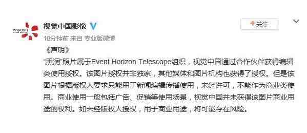 不过就在今天4月11日,视觉中国网站上出现了昨晚公布的人类史上首张黑洞照片。并注明此图如用于商业用途,请致电或咨询客户代表。