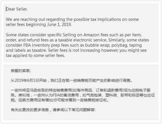 最近,有卖家在后台收到亚马逊一封邮件,邮件内容称,自2019年6月1日起,亚马逊将对美国站的卖家征收一些税收费用,可能会影响卖家的销售成本。