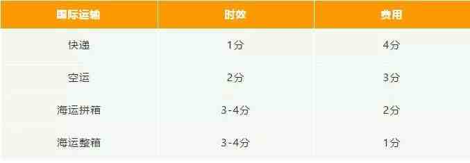 从货源地到亚马逊仓库的这段路程称之为头程,头程运输成本又根据海陆空的时效有价格的高低。以下按照时效由快到慢 & 费用由低到高打分1~4分,给大家直观地展示。