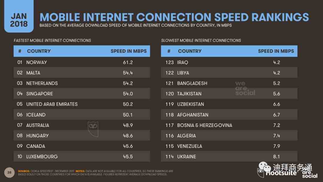 阿联酋有着地区首屈一指的网络基础设施。We Are Social公司2018年全球数字报告显示,阿联酋的移动数据网络平均下载速度达到50.2mbps,在全球排名第5。