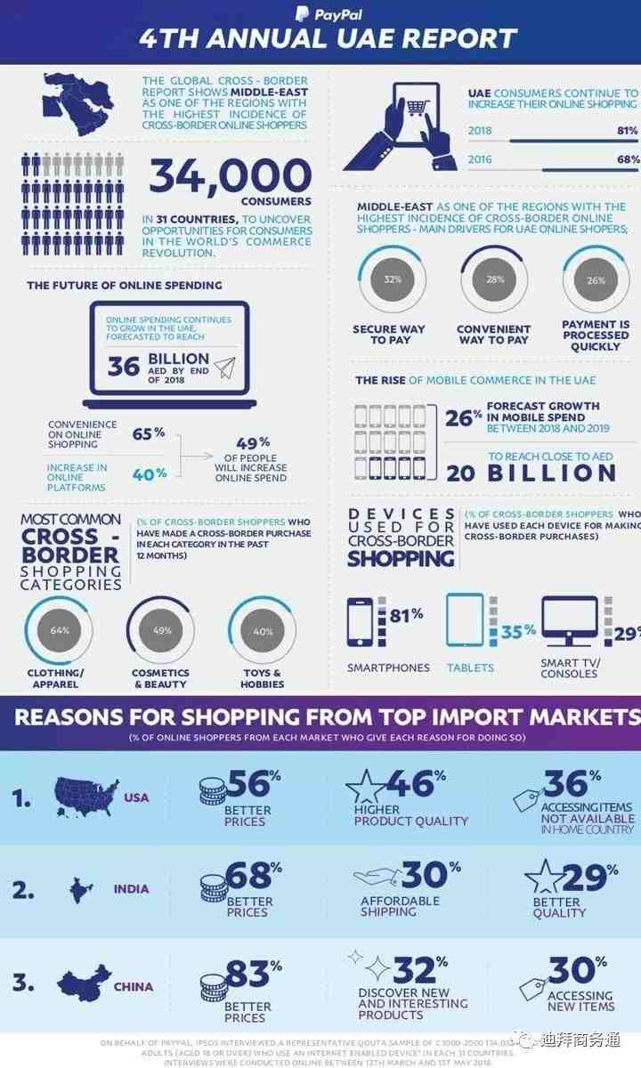 知名在线支付服务商贝宝(PayPal)和益普索(Ipsos)最新报告显示,阿联酋在线支付业务持续增长,预计2018年总额度为360亿迪拉姆(约合98亿美元)。报告称,2018年共有81%的阿联酋成年消费者使用过网上购物,较2016年提升13个百分点。其中,跨境购物比例为61%,较2017年提升33个百分点。预计2018-19年,阿联酋移动支付业务将达到200亿迪拉姆(约合54.5亿美元),增长26%,而2020年将再增25%。