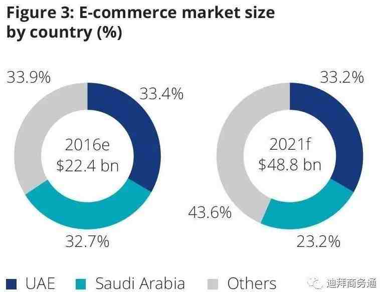 咨询公司德勤(Deloitte)的一份报告指出,2016年中东地区线上销售总收入224亿美元,同比增长24%;预计2016-2021年将保持16.9%的复合年均增长率。到2021年,中东地区电子商务市场总额预计将达488亿美元。其中,阿联酋和沙特成为领军者,二者联合比重超过地区市场总额一半以上。