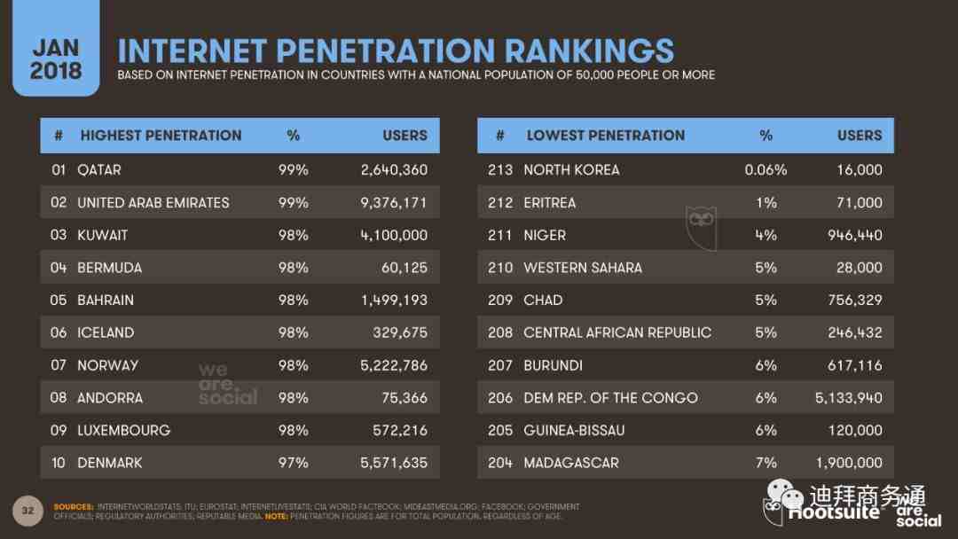 而根据We Are Social公司的2018年全球数字报告(Global Digital Report 2018),阿联酋互联网用户总量为9,376,171人,渗透率达到99%。位列全球第二,仅次于卡塔尔。