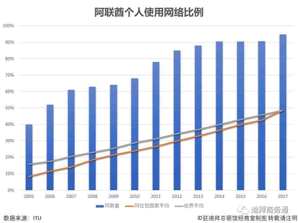 根据国际电信联盟(ITU)的统计数据,2017年阿联酋个人使用网络的比例继续提升,从2016年的90.60%变为94.82%,位列全球第17名,在阿拉伯国家中仅略低于科威特(98.00%)、卡塔尔(95.94%)和巴林(95.88%)。