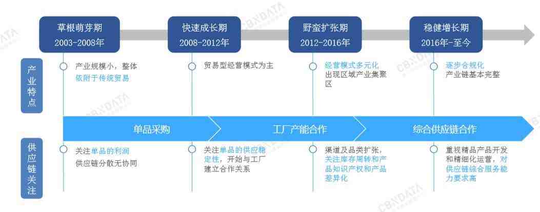 对于跨境电商来说,商品成为跨境电商满足海外需求的核心,是跨境电商的起点也是终点。从2003年开始到现在,跨境电商经历过草根萌芽期、快速增长期、野蛮扩张期和稳健增长期,整个产业链基本成熟。
