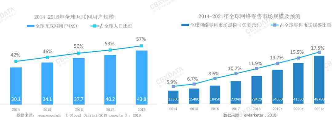 截止至2018年,全球互联网渗透率已接近60%;互联网用户增长一方面带来线下消费的线上迁移,另一方面线上购物体验则进一步激发了用户消费需求,预计到2021年,全球网络零售市场规模超过4.8万亿美元,占全球零售市场规模达17.5%。