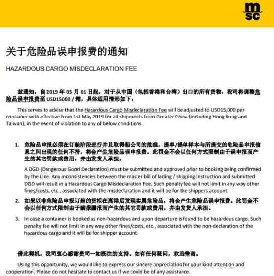 近日,据获悉,MSC地中海航运发布通知称,自2019年05月01日起,对于从中国(包括香港和台湾)出口的所有货物,将调整危险品误申报费至USD15000/箱,具体适用情形如下:
