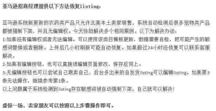 亚马逊系统更新的农药类产品只允许北美本土卖家销售,系统自动检测后很多宠物类产品都被强制下架,并且无编辑权。今天协助解决多个相同案例。以下为解决办法:
