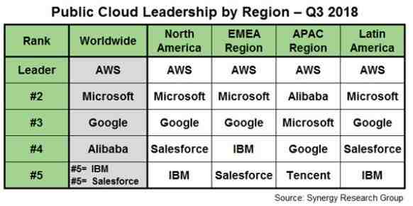从上图可以看出,在全球主要四大区域的三个区域中,都是AWS、微软和谷歌排名前三。只有亚太区是个例外,阿里云排名第二,腾讯云排名第五。