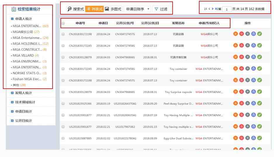 通过上述操作,我们可以得到检索结果共14页,162条数据(见右上角红框)。专利代理人会在所有数据中逐一筛选排查,以选出与产品相关的专利;