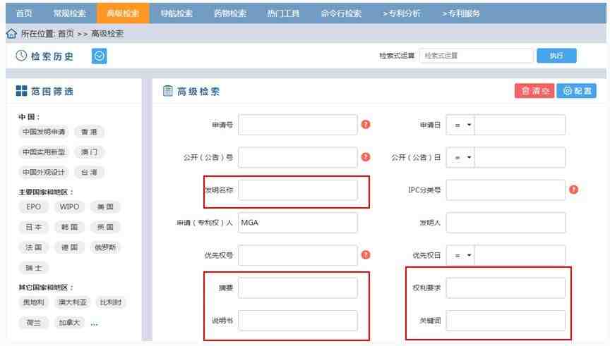如果确实对产品信息了解不多,也无法查知产品权利人,那只能用这一招——多种途径配合检索了。即将已知的信息填入相应检索框中(如发明名称、摘要、说明书、权利要求、关键词等),然后进行检索,且需使用不同的检索式进行多次检索,尽可能地检索到较多相关专利信息后再进行筛选、比对。