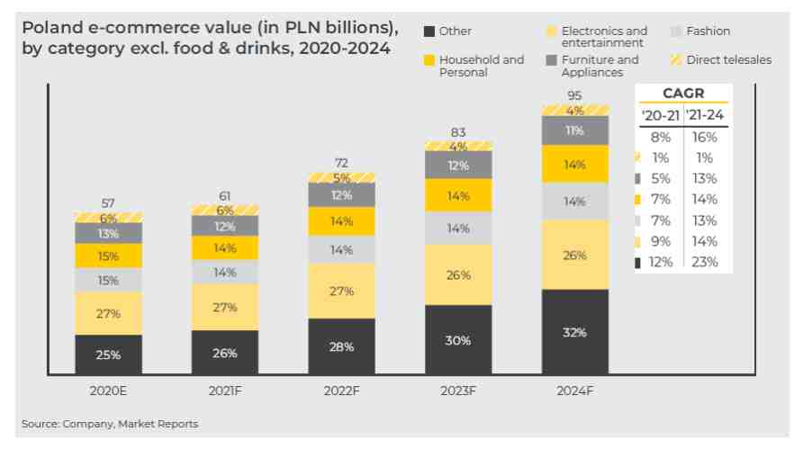 卖方通获悉,根据快递公司InPost的预测,到2024年,波兰电商市值将达到950亿兹罗提(食品和饮料类别除外)。电商交易将占据波兰“贸易蛋糕”越来越大的份额。 据了解,2019年波兰电商市值360亿兹罗提。受疫情封锁的影响,2020年市值高达570亿兹罗提,同比增长56%。随着疫情的缓和,波兰电商市值在2021年只增长了40亿兹罗提。 数据显示,2019年波兰电商销售额约占总零售额的13.3%,2020年这一比例增至14.8%,2021年增至22%。可以看到,电商越来越深入人心,网购开始成为波兰人的日常习惯。 出于以上原因,InPost预测,2022年波兰电商市值将增长110亿兹罗提,2023年将增长110亿兹罗提,而2024年将更高,增长120亿兹罗提。到2024年,波兰电商销售额将占据总零售额29.2%的份额。 根据InPost的预测,到2024年,电子产品和娱乐设备类别将占据波兰电商市场26%的份额。紧随其后的是时尚、家庭和个人护理类别,份额分别约为14%。其次是家具和家电(11%)、电话(4%)类别。