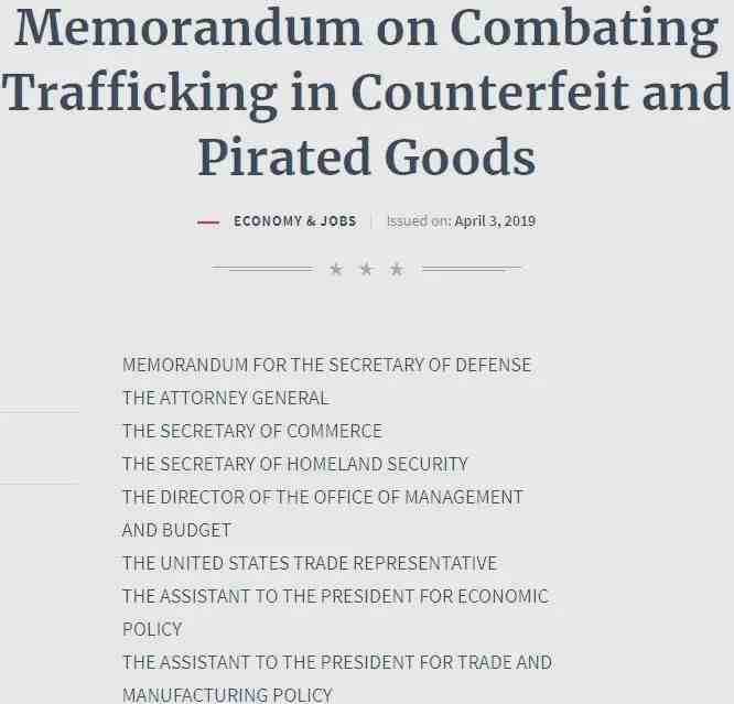 备忘录中写道:“保护美国企业、知识产权所有者、消费者、国家和经济安全、以及美国公众免受假货和盗版货(包括那些通过第三方电商平台和其他第三方中介进口的商品)的危险和负面影响,是本届政·府的政策。我们必须改进联邦政·府内部的协调努力,以应对这一挑战。”