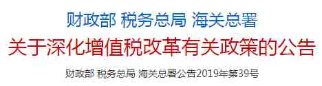 3月20日,《财政部 税务总局 海关总署 关于深化增值税改革有关政策的公告》(财政部 税务总局 海关总署公告2019年第39号)正式发布。