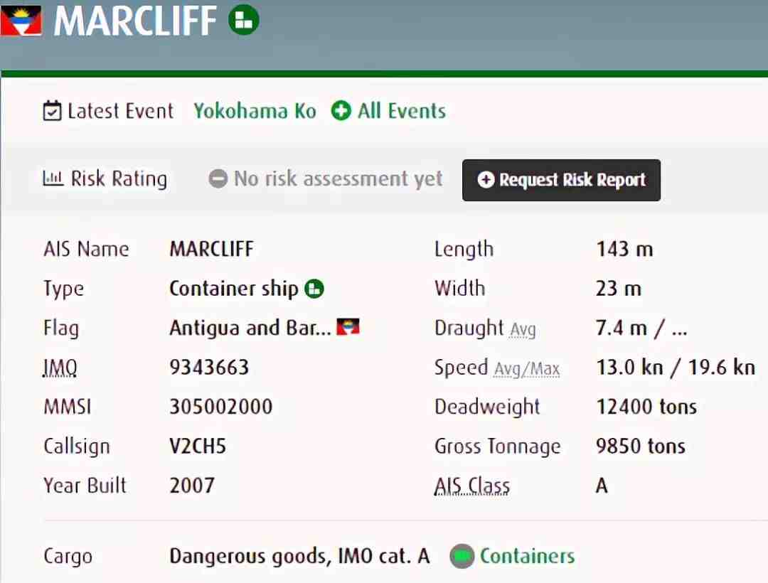 据消息称,一艘安提瓜旗的集装箱船"MARCLIFF"轮,事发时正离开横滨前往名古屋,碰撞了APL GUAM轮,在与APL GUAM分离后,MARCLIFF又与抛锚的HANSA STEINBURG轮发生了相撞或接触.