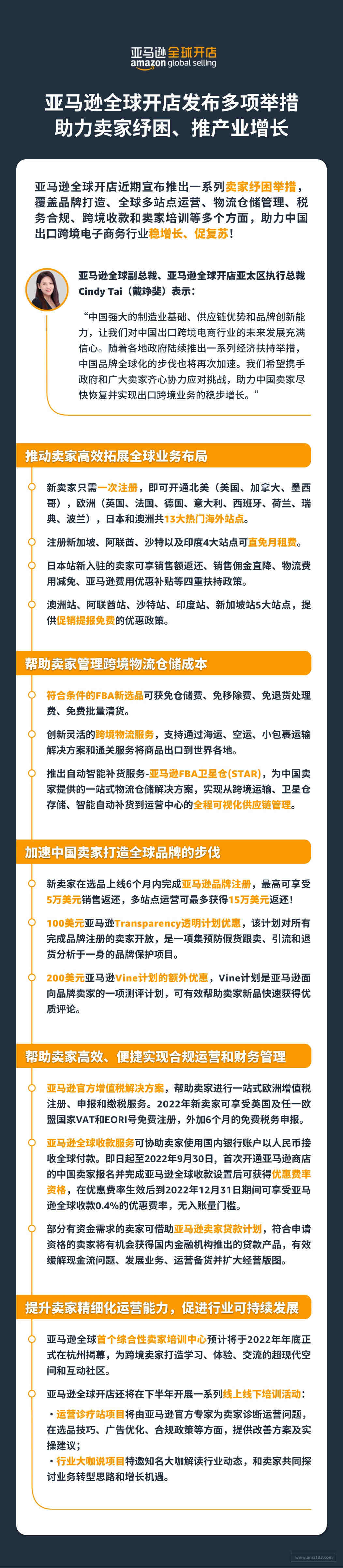 2022年6月1日,中国上海 — 亚马逊全球开店近期宣布推出一系列卖家纾困举措,覆盖品牌打造、全球多站点运营、物流仓储管理、税务合规、跨境收款和卖家培训等多个方面,旨在帮助中国出口跨境电子商务行业稳增长、促复苏,助力中国卖家进一步拓展全球业务并打造国际品牌。亚马逊全球副总裁、亚马逊全球开店亚太区执行总裁Cindy Tai(戴竫斐)表示:“中国强大的制造业基础、供应链优势和品牌创新能力,让我们对中国出口跨境电商行业的未来发展充满信心。随着各地政府陆续推出一系列经济扶持举措,中国品牌全球化的步伐也将再次加速,我们希望携手政府和广大卖家齐心协力应对挑战,助力中国卖家尽快恢复并实现出口跨境业务的稳步增长。”