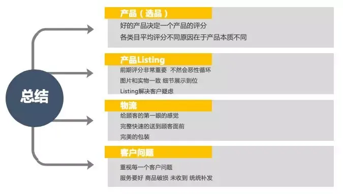 我们可以从以下四个方向着手优化产品评分:巧妙选品、优化产品Listing、提升物流服务以及处理客户问题,并根据以上四个优化方向提前思考优化和解决方案。