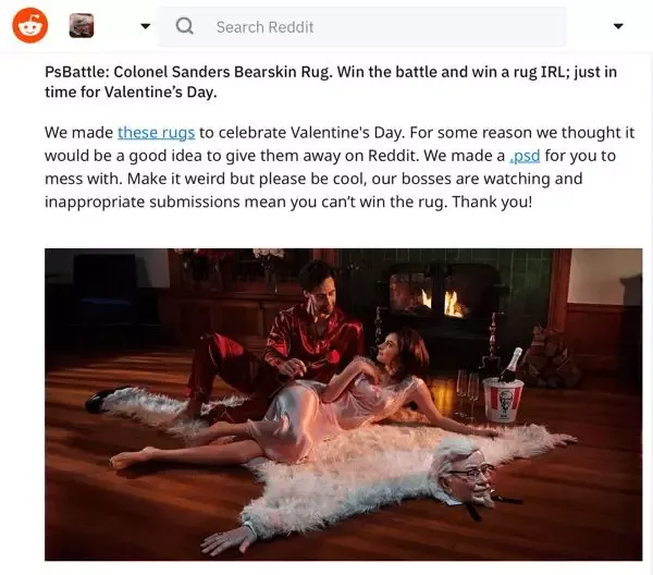 每一个主题帖的获奖者,将赢得肯德基的终极约会之夜套餐,里面有一款限量版仿熊皮白色地毯,形似肯德基著名炸鸡创始人哈兰•桑德斯上校,以及炸鸡睡衣、肯德基的礼品卡年等奖品。这种广告策略可以说是很奇葩了,但是妙在,肯德基目标受众瞄得准,主题帖发在了创意类的社区。