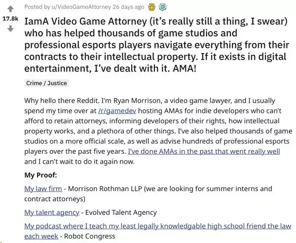 几年来,他用VideoGameAttorney 的账号持续在电竞板块回答问题。最近在r/gamedev板块,他的帖子平均每篇有几百条评论。而在 r/IAmA (问答板块)中的回帖有将近1800条评论以及超过15000个点赞。