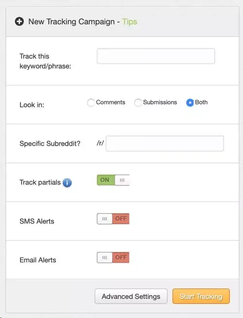如果有人在Reddit上使用你设置的关键词或短语,TrackReddit(具有免费和高级功能)就会向你发送提醒。这样,你就可以在用户提及你的品牌时快速进入,并加入到确切主题或产品类型的对话中。设置方式如下图所示: