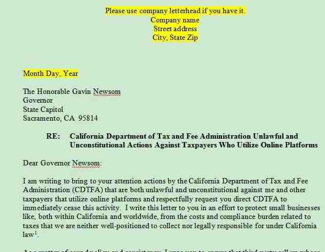 为了不补缴税款,一些卖家已经行动起来,有的致电州长Gavin Newsom办公室,强烈要求他帮助第三方卖家,并表达对Fiona Ma的支持。还有个在线卖家协会组织了“写信活动”,呼吁大家赶紧行动起来,并表示: