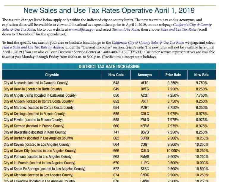 此外,卖家还要注意,加州税费管理局已经发公告称,将于2019年4月1日起施行新的销售税和使用税率。