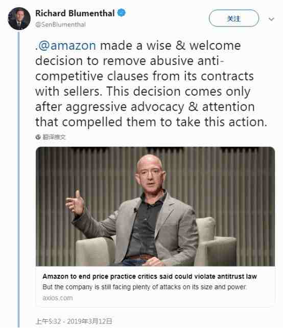 Blumenthal马上就在推特上对亚马逊的这一举动进行了赞扬,称亚马逊做出了一个明智而受欢迎的决定,删除了在卖家合同中滥用的反竞争条款。同时也指出,只有在积极的宣传和关注迫使他们采取这一行动之后,亚马逊才会做出了这一决定。