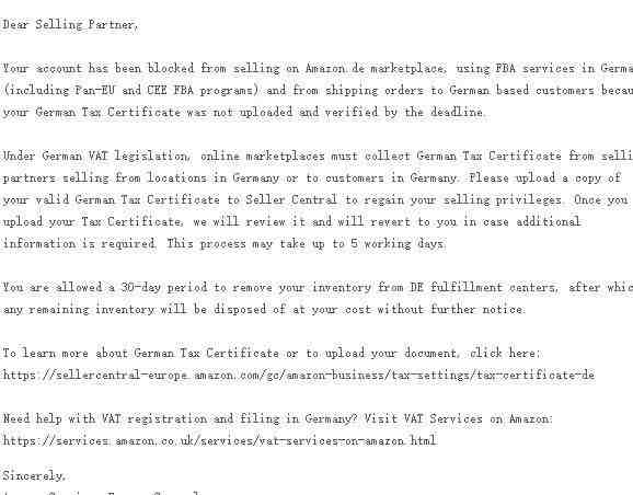 根据小分身收集的信息来看,至少九成的德国站卖家都收到了这个封号事件的波及,不管是有没有税号的,传没传税务副本的,自发货还是FBA的都无一例外。