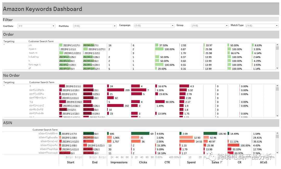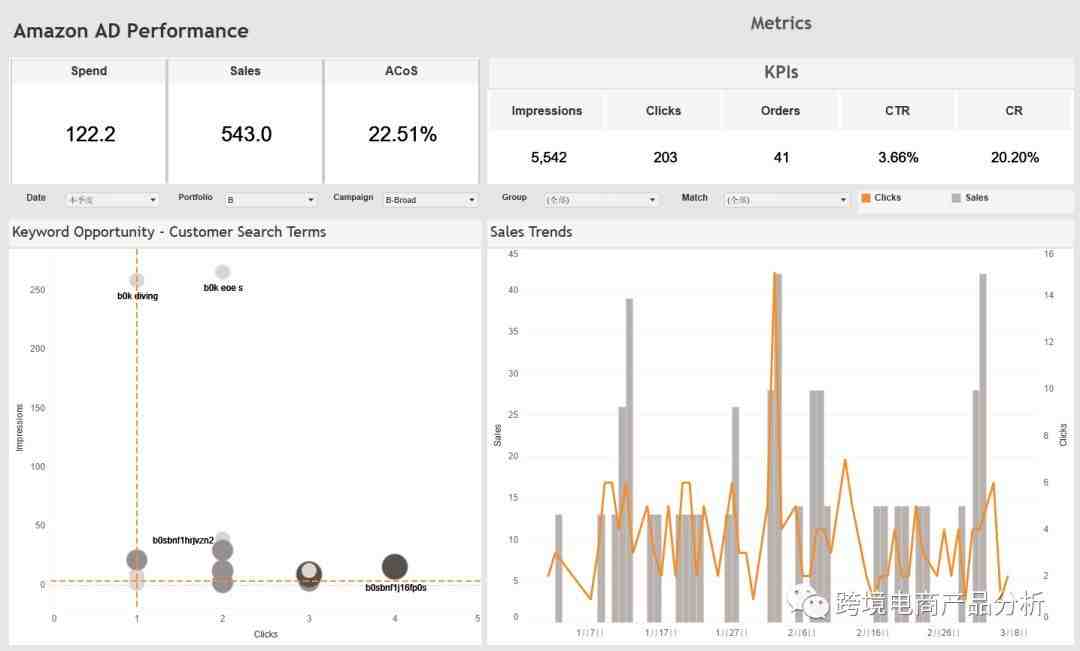 我觉得最实用的是把第三方工具和自己的定制报表相结合,实现人机交互。什么意思呢?因为亚马逊暂时没出来定时开关,自动加词等等的高级功能,所以有一个靠谱的第三方工具势必会事半功倍。同时,有些第三方无法实现的图表可以自己来制作,达到相辅相成。下面我用Tableau举例,用两个仪表盘Dashboard来解释如何快速得到想要的信息。