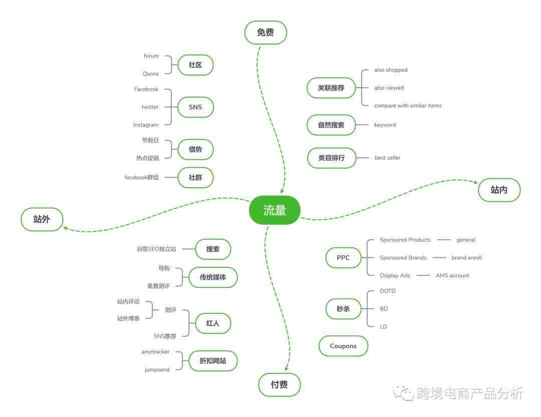 说到如何寻找流量,我们不妨用四个维度进行划分:站内,站外,免费,付费。下图的四象限坐标轴涵盖了基本的流量获取渠道。从大的框架来分,无非是站内流量和站外流量。再加上推广的投入,分成了免费和付费。从站内免费的角度来说,可以从站内页面寻找突破口,关键词搜索的入口,Best seller的推荐,具体到产品页面的关联推荐,可以用 yasiv.com 查找相关产品。从站内付费的角度,主要是广告,秒杀和Coupons等等。PPC广告又可以分三个模块:最常见的广告,品牌广告和AMS广告。每种广告的展示位置、竞价方式、打法策略有所差别。加上秒杀和coupon,又构成了不同的运营方式。站外免费的道路不是一蹴而就,需要不断的通过论坛,社区,社交媒体等等沉淀品牌。当然,也不排除优秀文案的爆发性影响。站外付费可以通过促销网站,红人推荐,博客测评等等得到短时间的流量爆发。所以,对流量的划分有了大致的概念后,你会发现亚马逊站内PPC广告是见效较快、性价比较高的推广方式。
