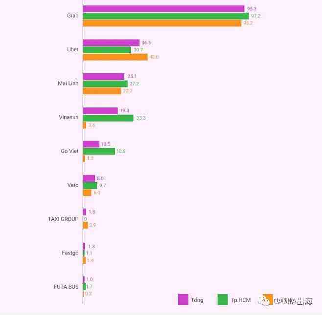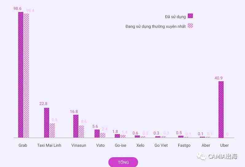 同样根据调查数据,过去大部分越南消费者使用Grab和Uber量大网约车服务,使用指数分别为98.6%和40.9%。同时还有不少消费者使用功能越南本土品牌Mai Linh和Vinasun。