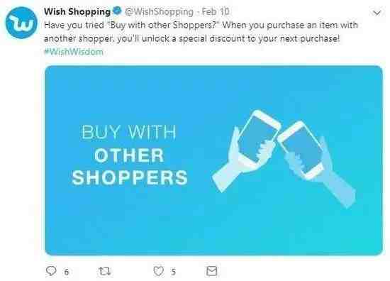 除了上述两个平台,移动电商平台Wish也在今年2月10日发布了官方Twitter称,如果消费者和其他消费者拼团购买同一件商品,那么该消费者将在下次购物时获得特殊折扣。该Twitter显示了目前Wish正在做拼团相关业务。