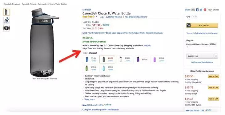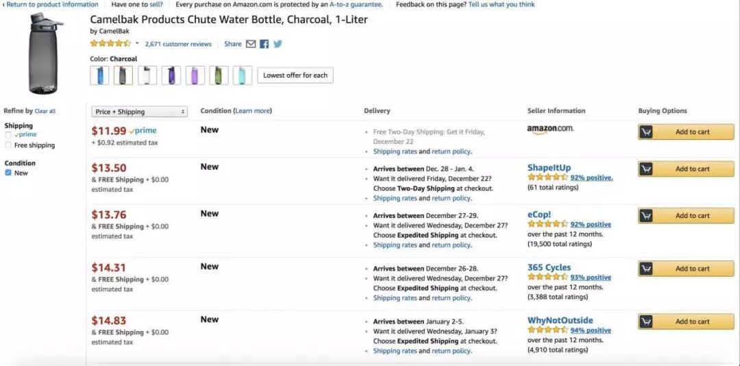 22位CamelBak卖家中,有Top 5卖家在争夺Buy Box,其中一个是亚马逊自己本身。作为卖家,你的目标是让自己的片名靠前,以便有更大的机会获得亚马逊Buy Box。当你获得Buy Box时,如果买家只是点击“添加购物车”按钮而不查看其他卖家listing及其价格,那么他们其实是直接向你购买产品。
