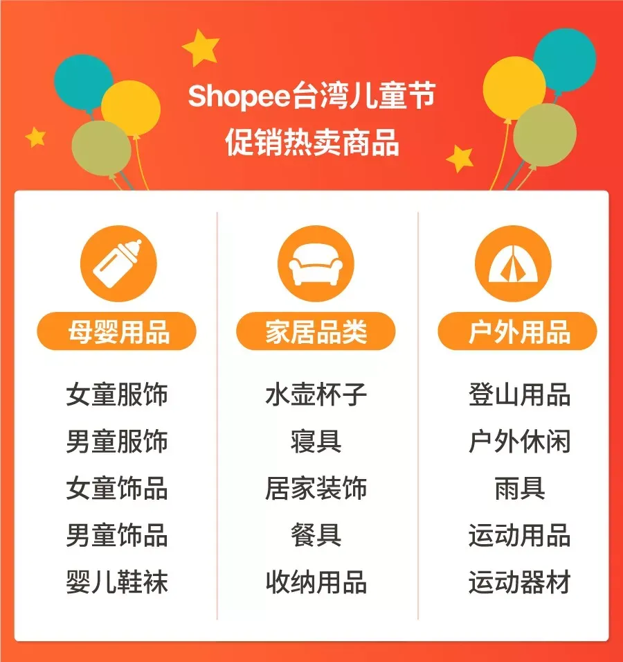 Shopee台湾站点将会在3月底至4月4日举办多场儿童节促销活动,如玩翻儿童节、儿童派对等。促销商品涵盖了童装童鞋、外出用品和玩具等,跨境卖家强势的母婴品类、家居用品、户外用品三大类目均会热卖。