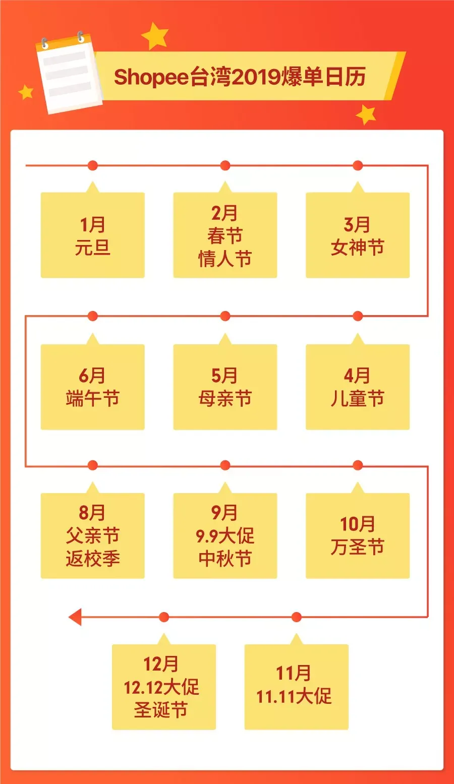 卖家朋友们,台湾市场2019爆单日历请速速收藏,积极备战每场大促!2019,跟Shopee一起扎根东南亚及台湾市场,展现国货主场优势!